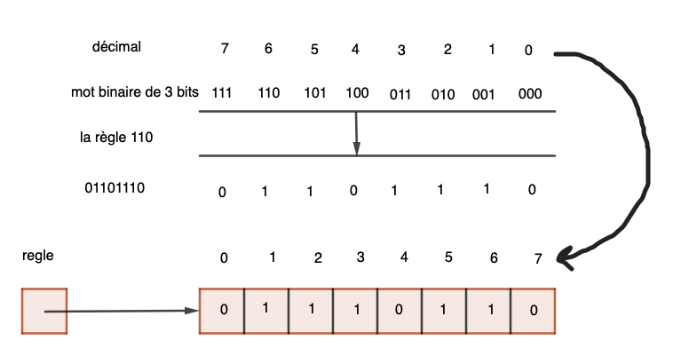 Cet octet sera mémorisé par un tableau octet = [0,1,1,1,0,1,1,0], car la règle en tant que fonction, est l'association de l'indice i à la valeur octet[i]