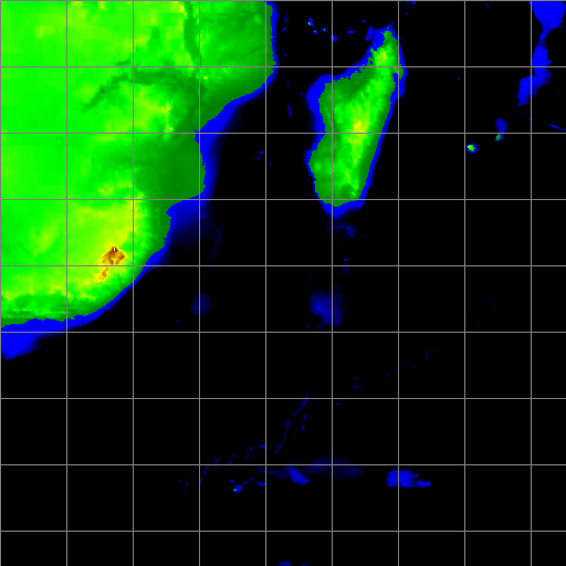 Madagascar , l'île de la Réunion et l'île Maurice apparaissent : des altitudes relevées par satellite sont converties en couleurs