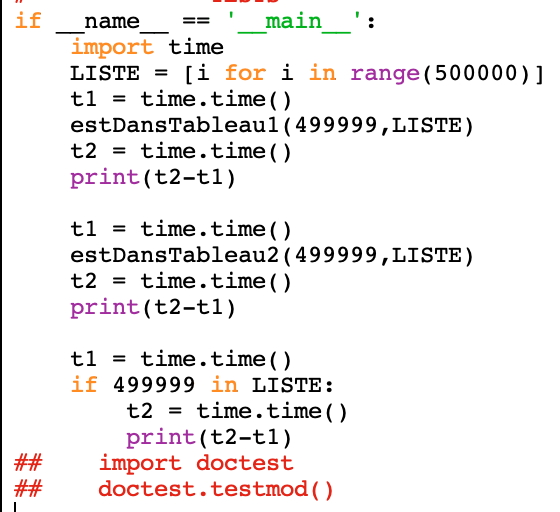 On observe que la fonction native in de Python est plus rapide que les deux fonctions estDansTableau(element,liste)